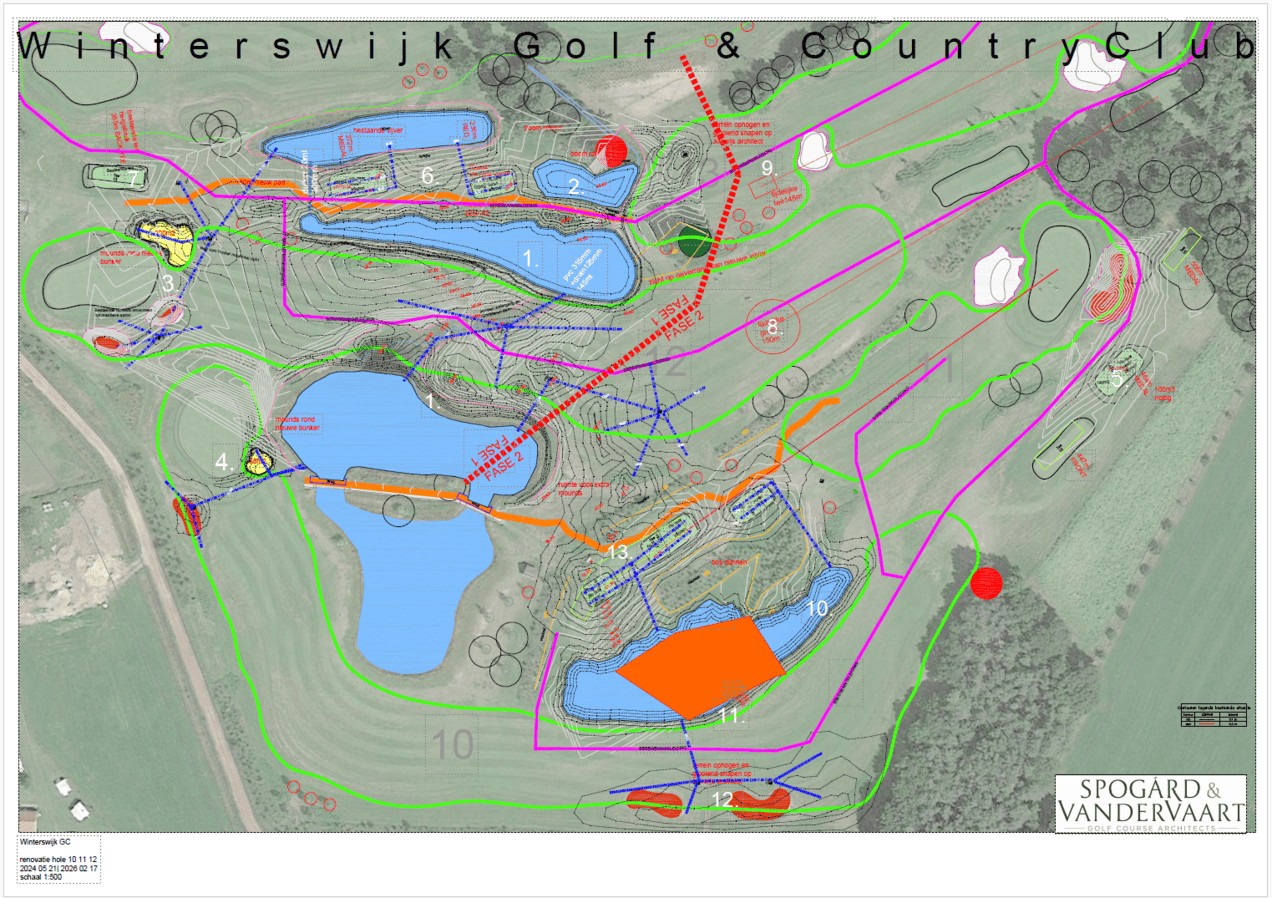 - Nieuwe waterpartij tussen hole 12 en hole 13 en dempen deel waterpartij op hole 12